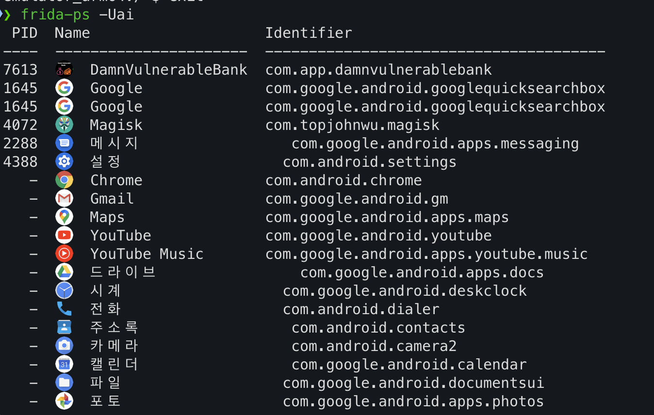 frida를 먼저 사용하기 위해서 앱을 종료해주어야 한다. frida-ps -Uai로 현재 실행중인 앱 및 프로세스를 확인할 수 있다. 그리고 frida-kill -U 프로세스명 명령을 통해 앱을 종료할 수 있다.