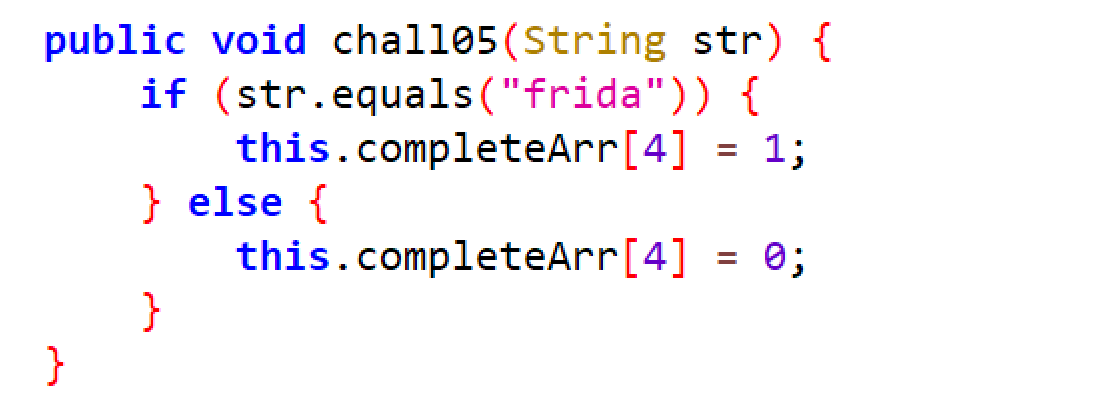 chall04 메소드에 frida라는 문자열을 전달하라고 나와있다. jadx 도구로 확인하면 MainActivity 클래스에 아래와 같이 전달받은 인자의 문자열이 frida면 complete 되는 것을 알 수 있다.