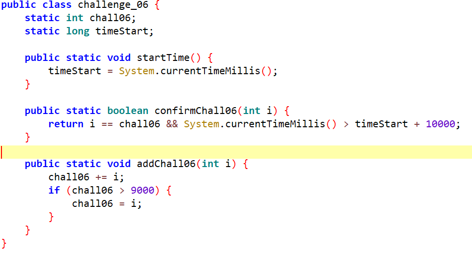challenge_06 클래스의 confirmChall06 함수는 boolean 인 것을 알 수 있고, 조건문을 확인해보면 i라는 변수가 chall06과 같아야 하고, 두 번쨰 조건은 startTime 메소드를 호출한 값을 timeStart에 저장하고 이 시간이 10초가 지나야 참이 된다.