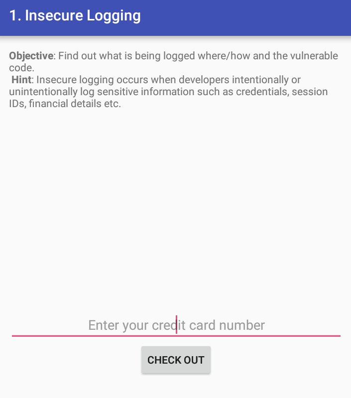 logcat이라는 adb 명령어를 이용해 로그를 확인할 수 있다. adb를 연결한 cmd 창에서 logcat을 입력해주자. DIVA 앱에서 123456을 입력하고 CHECK OUT 버튼을 누르면 아래와 같이 logcat에서 credit card number가 평문으로 노출된 것을 확인할 수 있다.