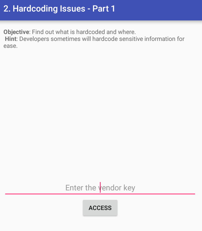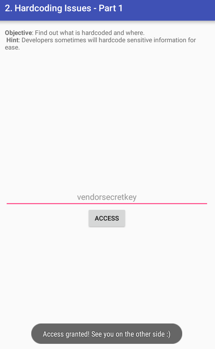 소스 코드를 분석하면 아래 equals 함수를 통해 vendorsecretkey의 문자열과 같은지 비교하고 있다. 아래 코드를 통해서 이 액티비티의 키 값에 vendorsecretkey를 입력하면 아래의 Access granted! 문자열이 나타날 것이다.