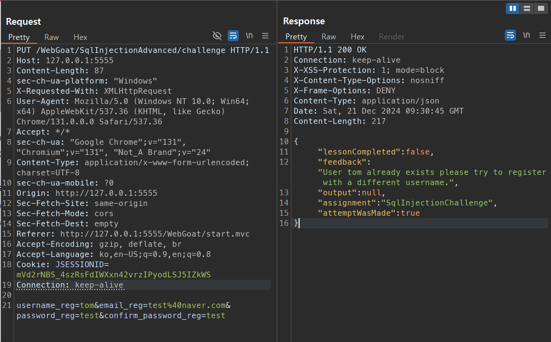 tom이라는 이름으로 비밀번호를 Blind SQLi로 알아내야 하는데 회원가입 기능에서 보면 tom 이라는 이름으로 로그인할 때 이미 존재한다는 응답으로 보았을 때 select문을 이용해서 아이디 중복을 체크한다는 것을 알 수 있다.