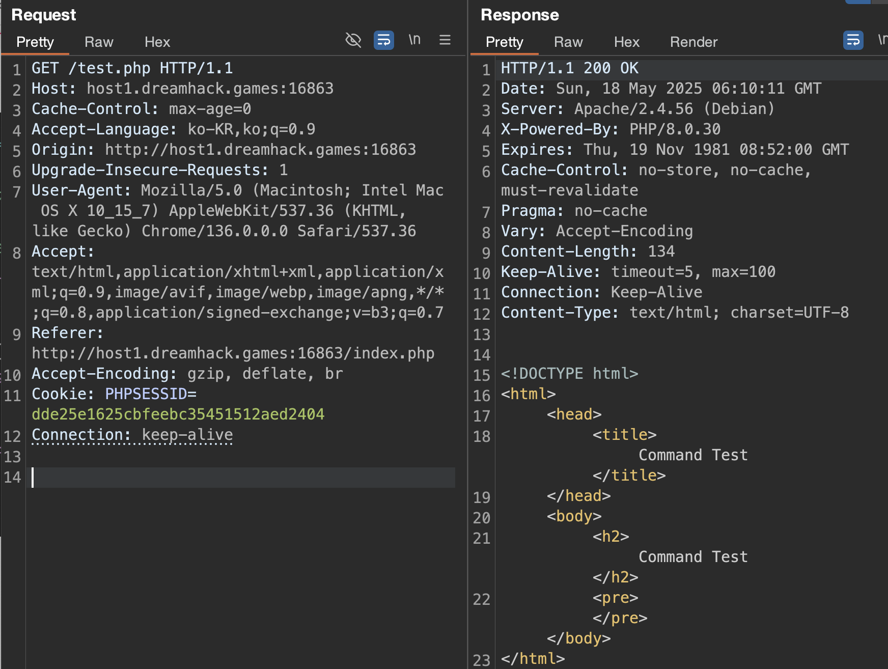 test.php 소스 코드를 살펴보면, pattern 변수에는 필터링 키워드가 존재하고, auth 세션이 admin이라면 GET 메소드에서 cmd 파라미터를 가져와 값이 존재하면 cmd값을 그대로 command에 저장하고, 값이 존재하지 않으면 ls로 command 변수에 저장한다. 다음으로 command 값에서 \n 이 존재하면 이를 없애고 command 값에 pattern 키워드를 정규표현식을 이용하여 필터링을 거친다. 마지막으로 escapeshellcmd 함수를 적용하여 &, #, ;, |, *, ?, ~, <, >, ^, (, ), [, ], {, }, $, \, ,, \, x0A , \xFF. " 문자 앞에 백슬래쉬를 추가하여 커맨드 실행 값을 resulttt 변수에 저장한다. 세션이 guest라면 그냥 ehco hi guest로 result 변수에 저장한다.